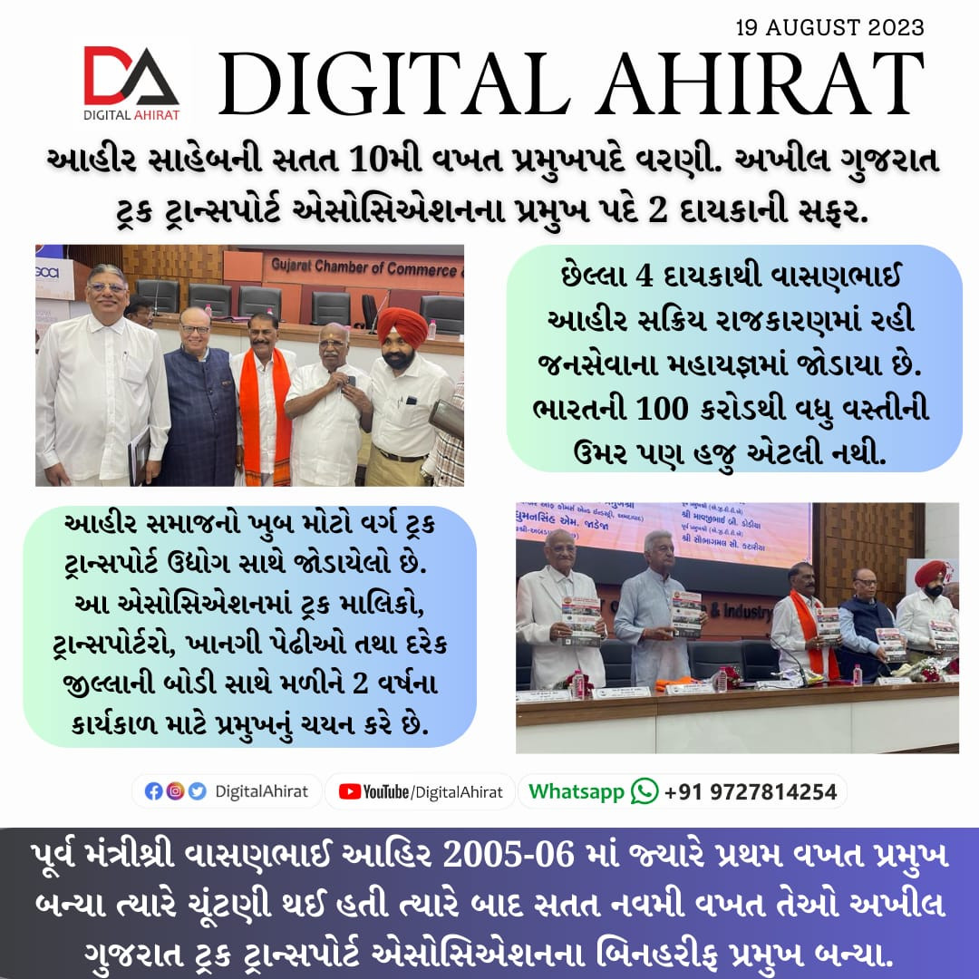પૂર્વ રાજ્યમંત્રી વાસણભાઈ આહીર ૧૦મી વખત અખિલ ગુજરાત ટ્રક ટ્રાન્સપોર્ટ એસોસિએશનના પ્રમુખ બન્યા.