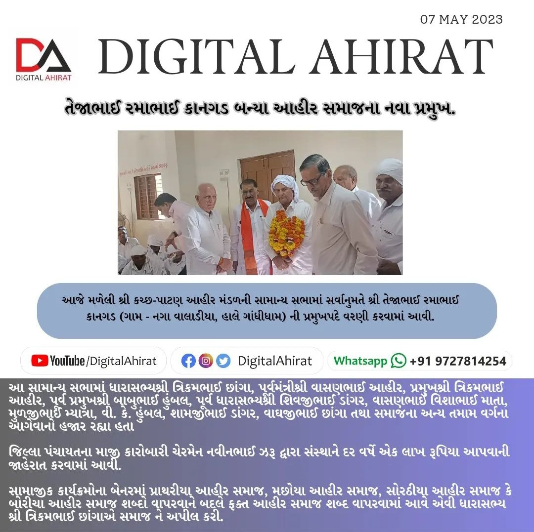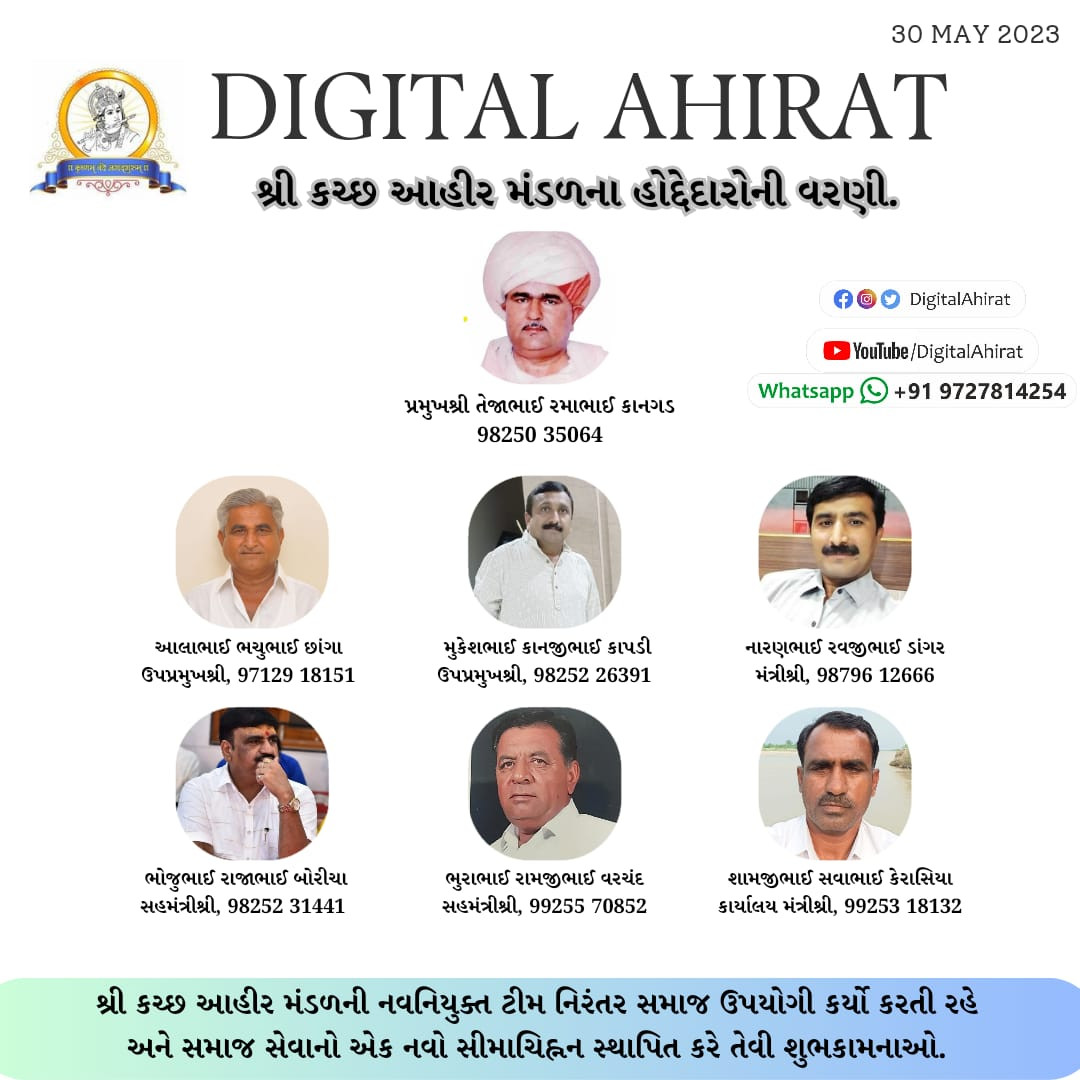 તેજાભાઈ રમાભાઈ કાનગડ શ્રી કચ્છ આહીર મંડળના પ્રમુખ બન્યા તથા નવી ટીમની રચના થઈ.