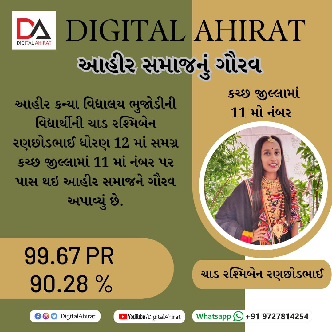 રશ્મિબેન રણછોડભાઈ ચાડ સમગ્ર કચ્છમાં ધોરણ 12 ની બોર્ડની પરીક્ષામાં 11મો ક્રમાંક પ્રાપ્ત કરી આહીર સમાજને ગૌરવ અપાવ્યું.