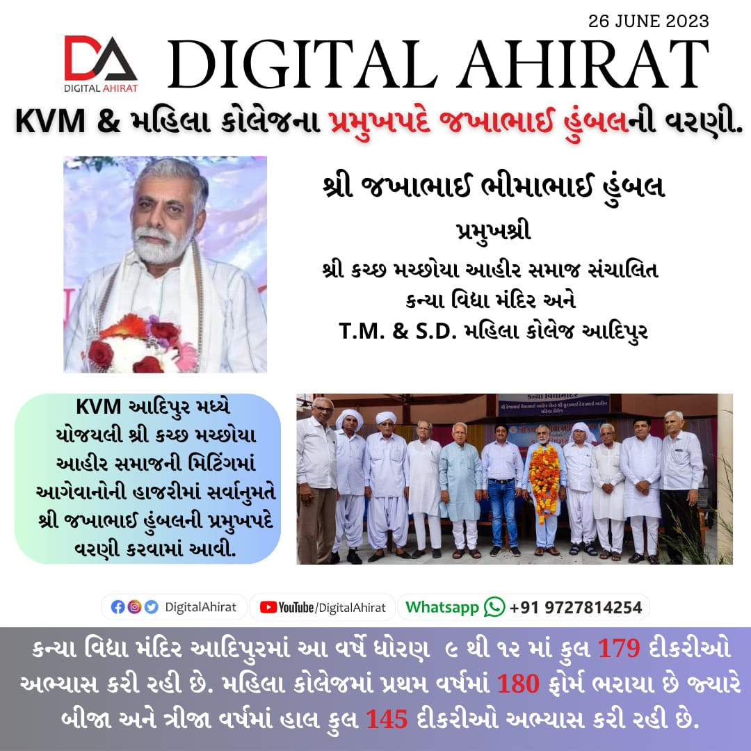 શ્રી કચ્છ મચ્છોયા આહીર કન્યા વિદ્યા મંદિર & મહિલા કોલેજના પ્રમુખપદે જખાભાઈ હુંબલની વરણી થઈ.