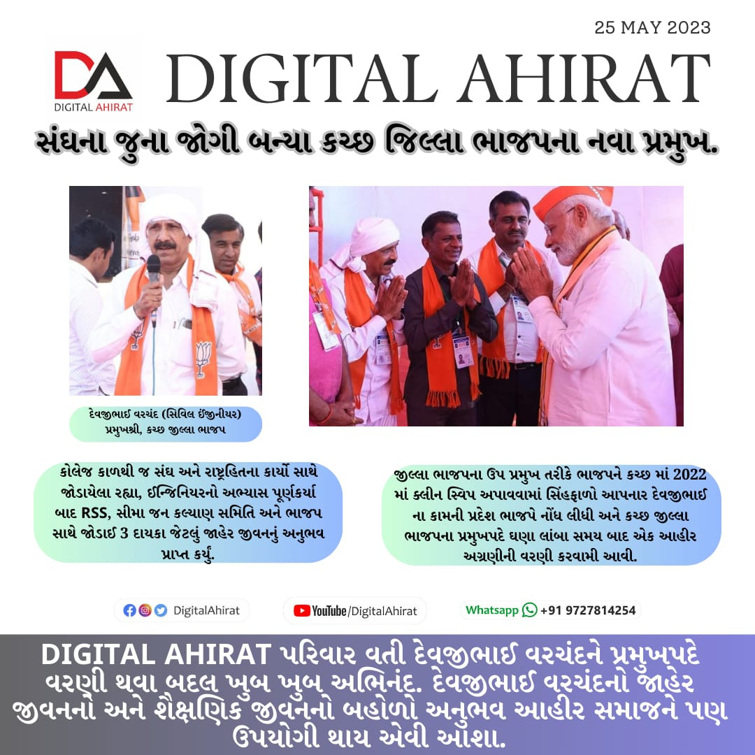 કચ્છના ઈતિહાસમાં પ્રથમ વખત જીલ્લા ભાજપનું સુકાનીપદ એક આહીરને સોંપવામાં આવ્યું. આહીર અગ્રણી દેવજીભાઈ વરચંદ જીલ્લા ભાજપના પ્રમુખ બન્યા.