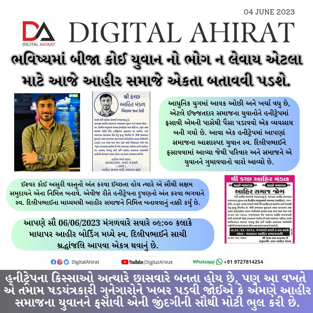 માધાપરના ચકચારી ભર્યા હનીટ્રેપ કાંડમાં દિલીપભાઈ આહીરને ફસાવામાં આવ્યો અને આહીર સમાજે એક આશાસ્પદ યુવાન ગુમાવ્યો.