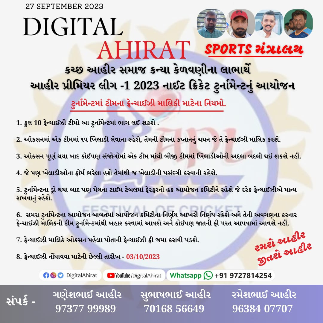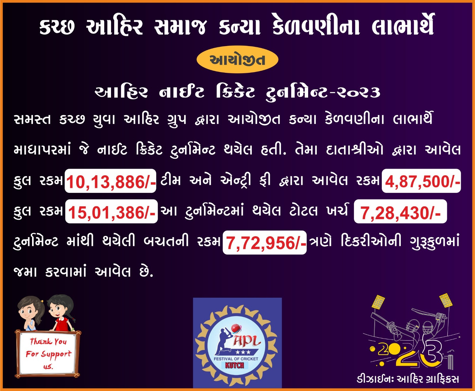 આહીર સમાજ કન્યા કેળવણી લાભાર્થે માધાપર મધ્યે આહીર પ્રીમિયર લીગનું આયોજન કરવામાં આવ્યું અને દીકરીઓના શિક્ષણ માટે 7,72,956 રૂપિયાની બચત કરાઈ.