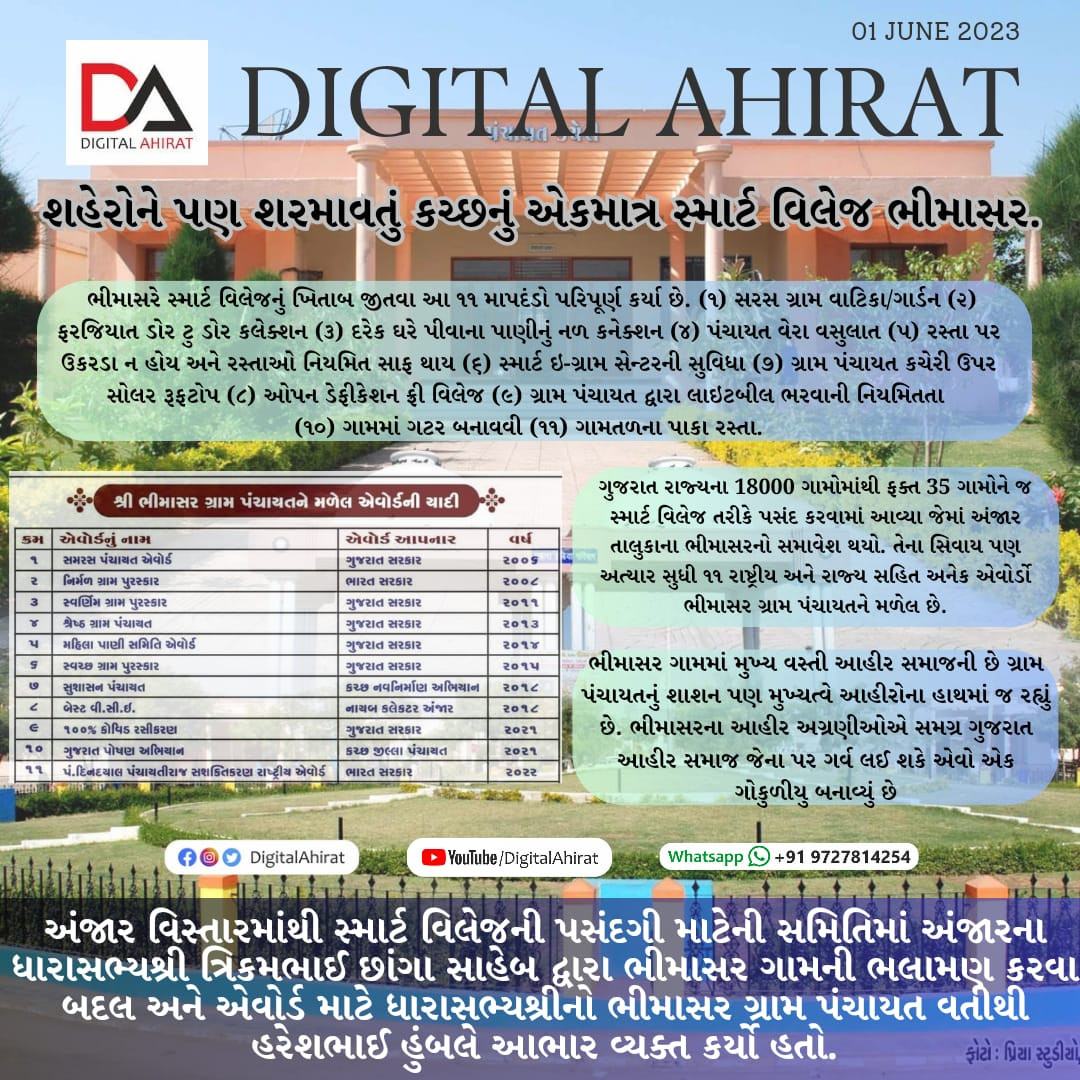 ભીમાસર ગામને સ્માર્ટ વિલેજ ઓફ ગુજરાતનો એવોર્ડ પ્રાપ્ત થયો.