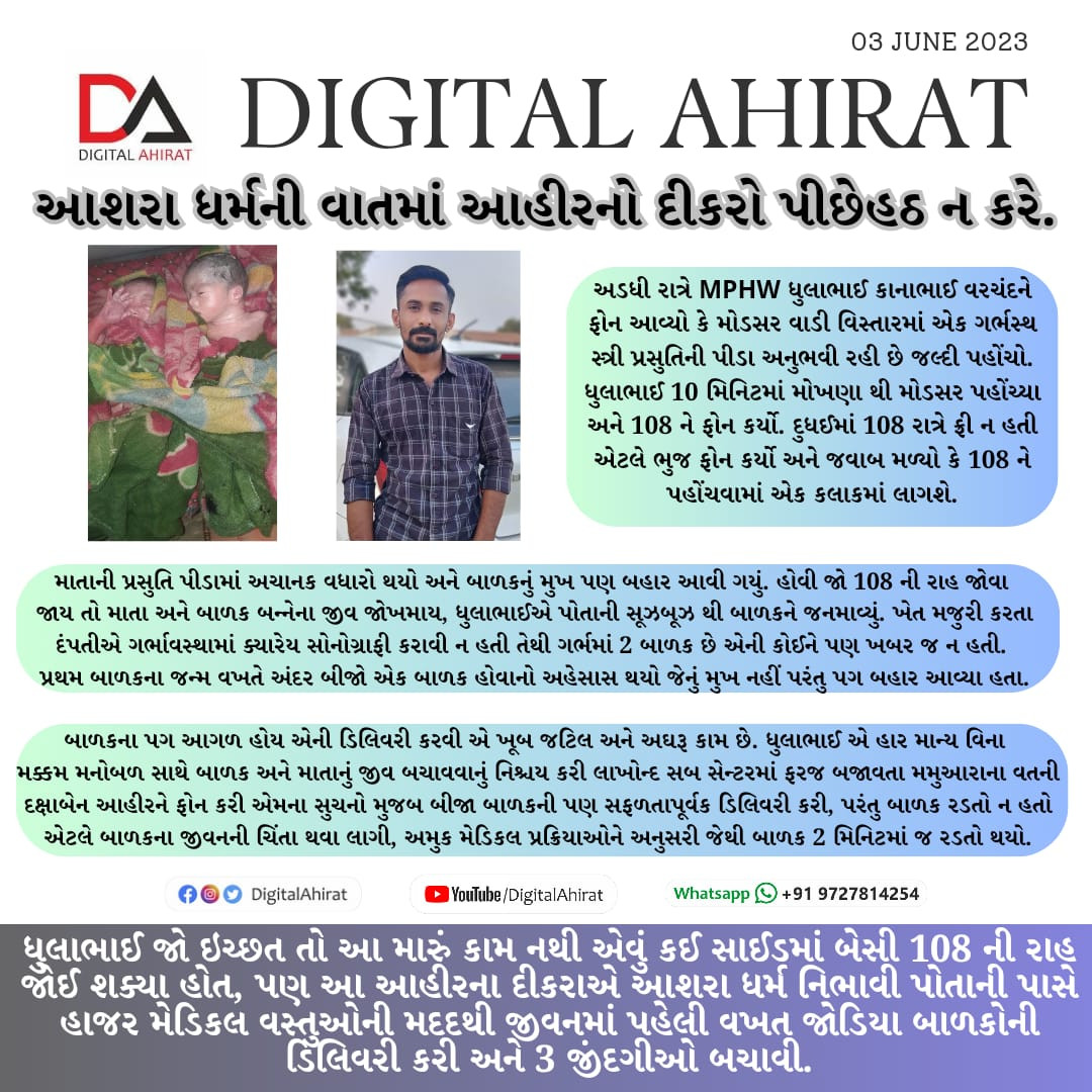મોખણા ગામના ધુલાભાઈ કાનાભાઈ વરચંદે આશરાધર્મ અને માનવતાનું ઉત્કૃષ્ટ ઉદાહરણ આપતા પ્રસુતિ દરમિયાન માતા અને તેના જોડીયા બાળકોને જીવનદાન આપ્યું.