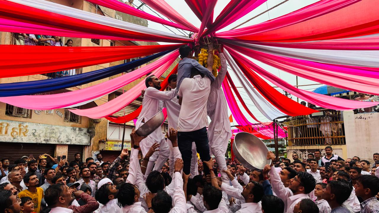 ત્યા રબાદ રામ નગર સમાજવાડીથી પરત આવતા ભીડભંજન મહાદેવ મંદિરના પુજારી દ્વારા પૂજન કરવામાં આવેલ હતું સાથે ભીડ ભંજન ગોપ મંડળ દ્વારા મટકી ફોડવામાં આવેલ હતી. શ્રી રાધે ક્રુષ્ણ મંદિરથી સોરઠીયા નાકા પ્રવેશ કરતા યાદવ ગ્રુપ દ્વારા મટકી ફોડવામાં આવેલ હતી. હનુમાન ચોક પ્રવેશતા હનુમાન ભક્ત મંડળ દ્વારા મટકી ફોડવામાં આવેલ હતી.